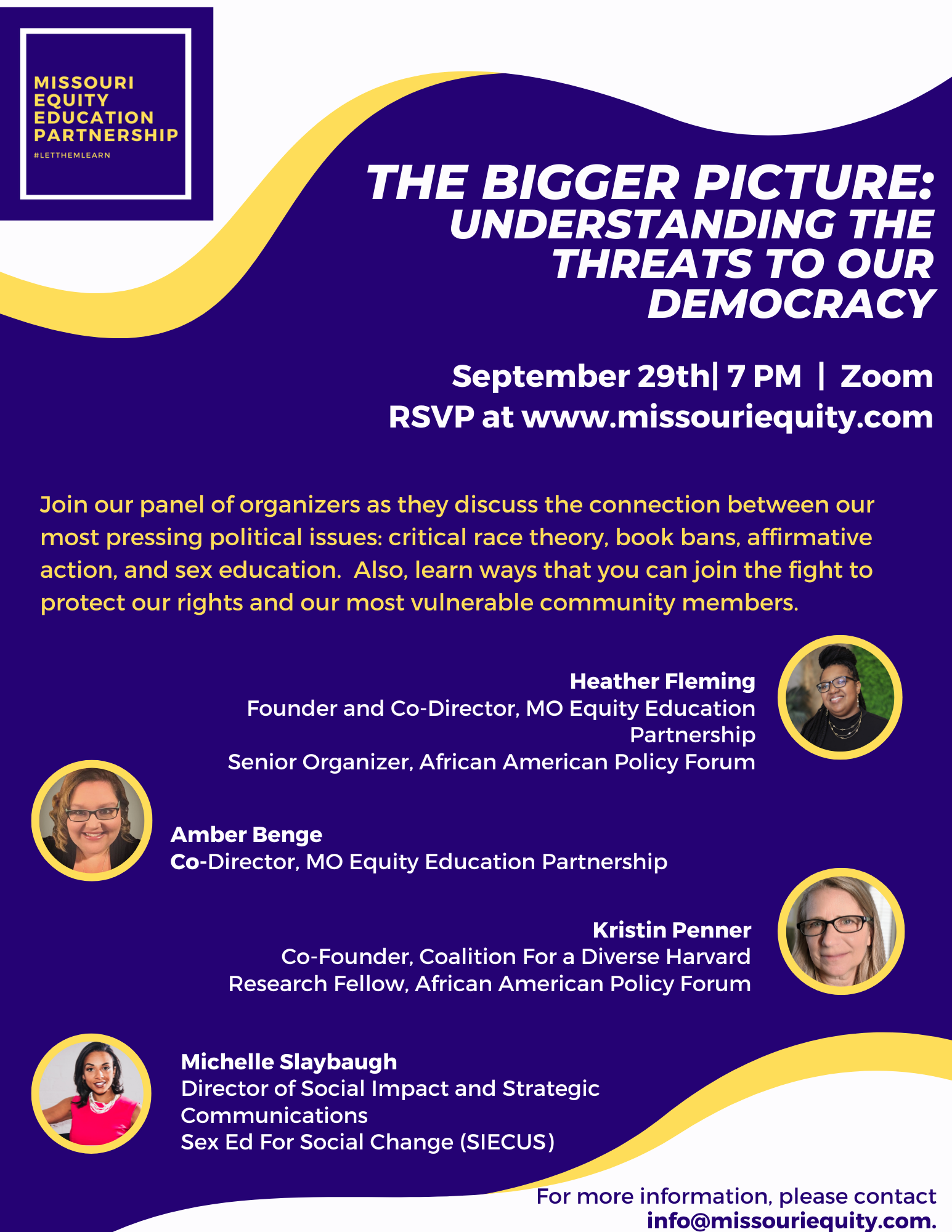 Back to All Events The Bigger Picture: Understanding The Threats To Our Democracy Thursday, September 29, 2022 7:00 PM 8:30 PM Google Calendar ICS Join our excellent panel of organizers as they discuss the connection between some of the biggest issues on the current political landscape: critical race theory, book bans, affirmative action, and sex education. Register today here.