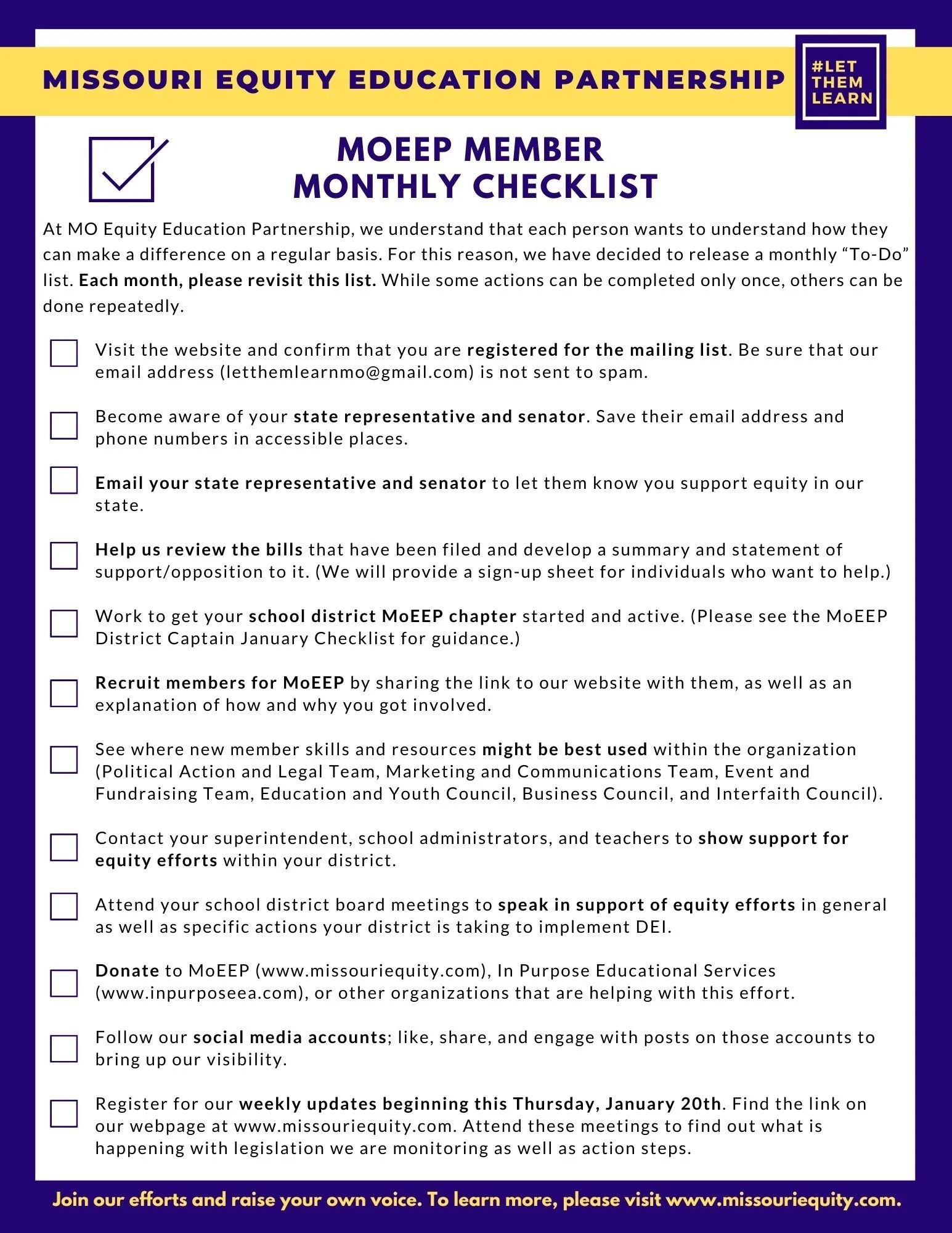 We have created this checklist to guide you through ways you can help work toward equity in your schools and community. Please revisit this at the first of each month and do as much as you can.