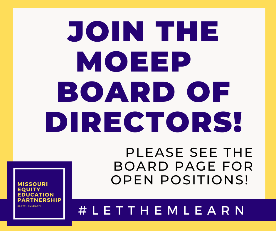 MOEEP’s Board of Directors serves the essential function of providing assistance and guidance to the executive director and other leaders on the MOEEP team. While most board members are recruited from long time supporters of MOEEP with a demonstrated record of support for equity, we also accept applications from individuals with specific skill sets. Please view our “Board of Directors” page to see who currently sits on our board and what positions we need to fill.
